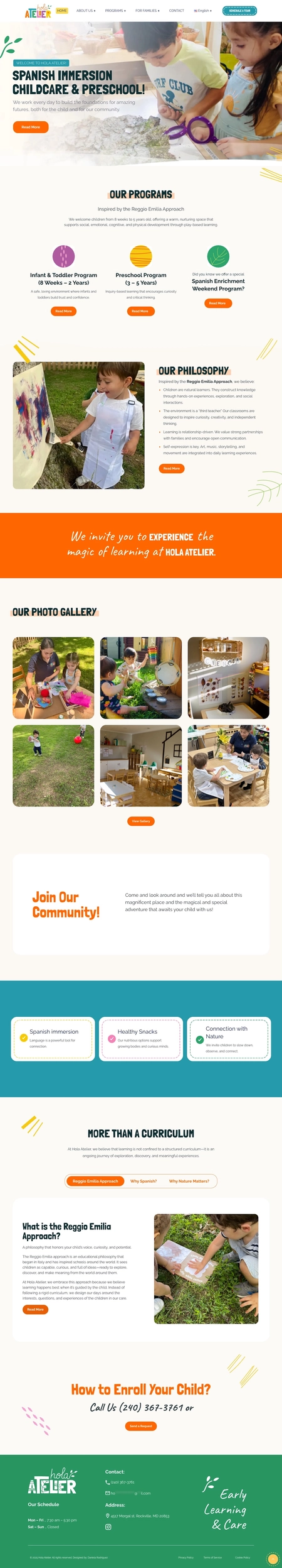 Hola Atelier is a Spanish immersion childcare and preschool program located in Rockville, Maryland. They serve children ages 8 weeks to 5 years old using an educational approach inspired by Reggio Emilia methodology, combining immersive Spanish language learning with play-based, child-centered pedagogy.